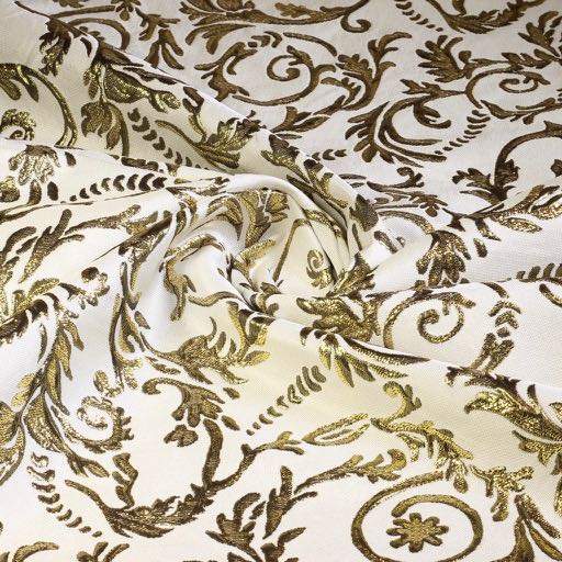 Jacquard is a fabric with a woven design that is visible on both sides. This fabric is suitable for making various types of clothing. This design is a runner up for carnival and theater and decoration The fabric differs slightly from a smooth jacquard. As you can see in the photo, parts in the fabric have a small bubble giving it an even richer look. This design is available from Funkytex in 8 different colorways. Extremely suitable for making a costume. Certain parts of the design have bubbles.