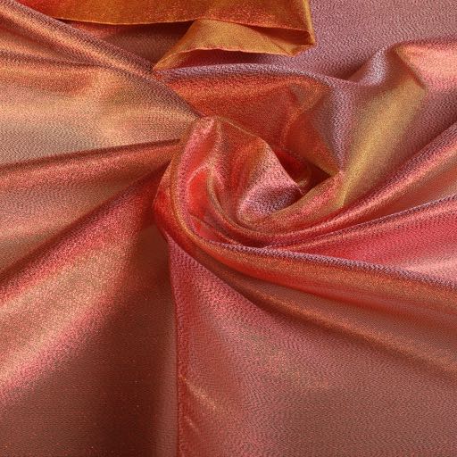 This fabric has a soft smooth back and a " crepe" front . It is a light weight fabric and weighs 50 grams/m2 . The fabric has a slight sheen , "lurex " appearance . Good to use for decoration and for making curtains.