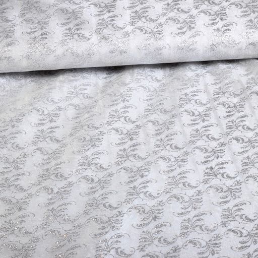 This luxurious, transparent fabric is also called Organza . It is printed with glitter in a damask design , when processing the fabric some of the glitter comes off . Due to its light weight, it provides a smooth fall and chic look . With its shimmering pattern, the fabric catches the light beautifully, giving a stylish and exclusive effect . The fabric is ideal for using curtains , net curtains , decorative upholstery , table linens and wedding and party decorations